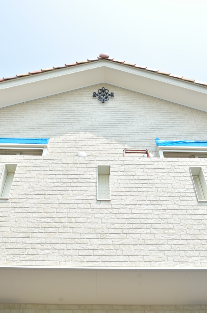 外壁は腰回りで2色に張り分けています。外壁の上側は白系ですので屋根の3色瓦ともうまく調和し