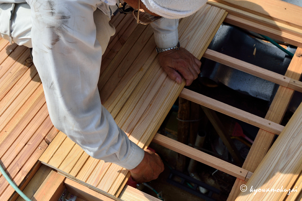 垂木の上に横桟を通して杉板を一枚一枚張っていきます。