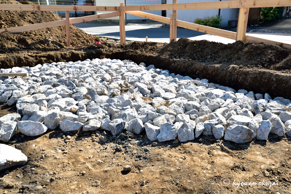 根切りをした後にベタ基礎の下地として割栗石を並べて目潰し砂利で隙間を